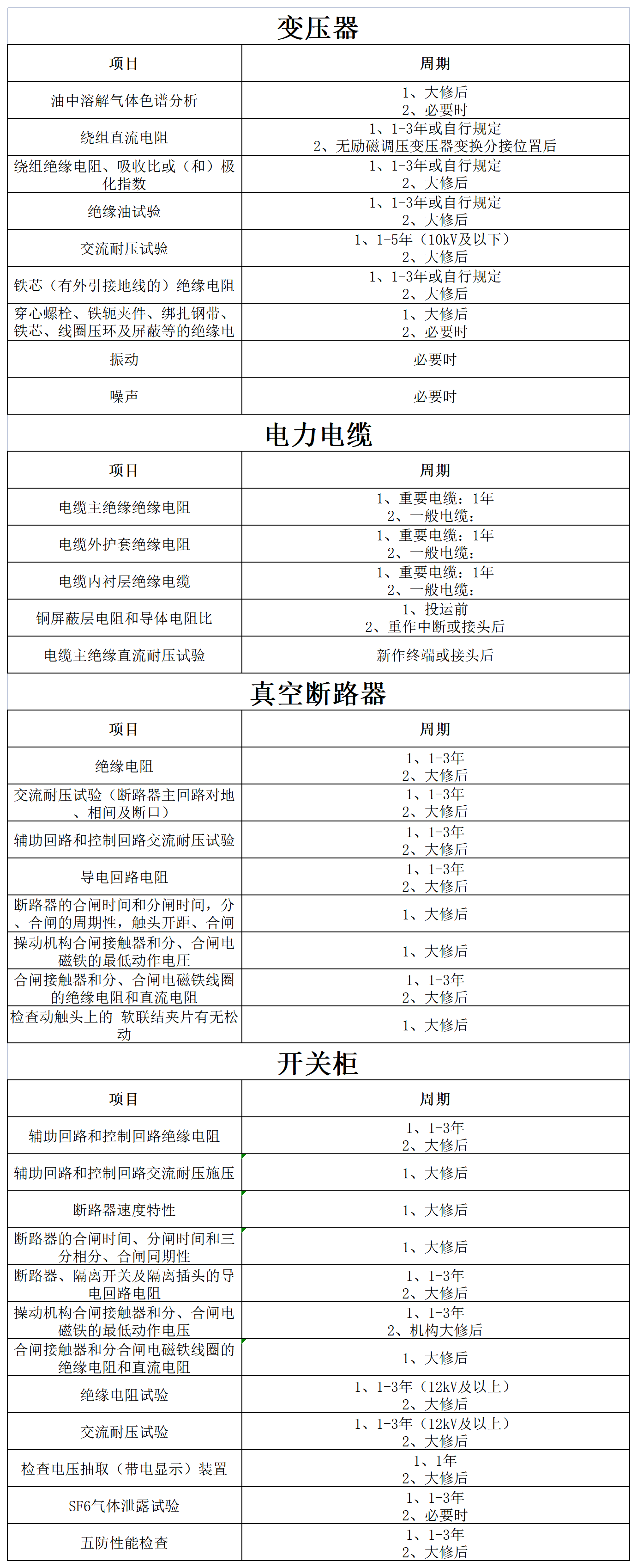 各项设备试验周期一览表: